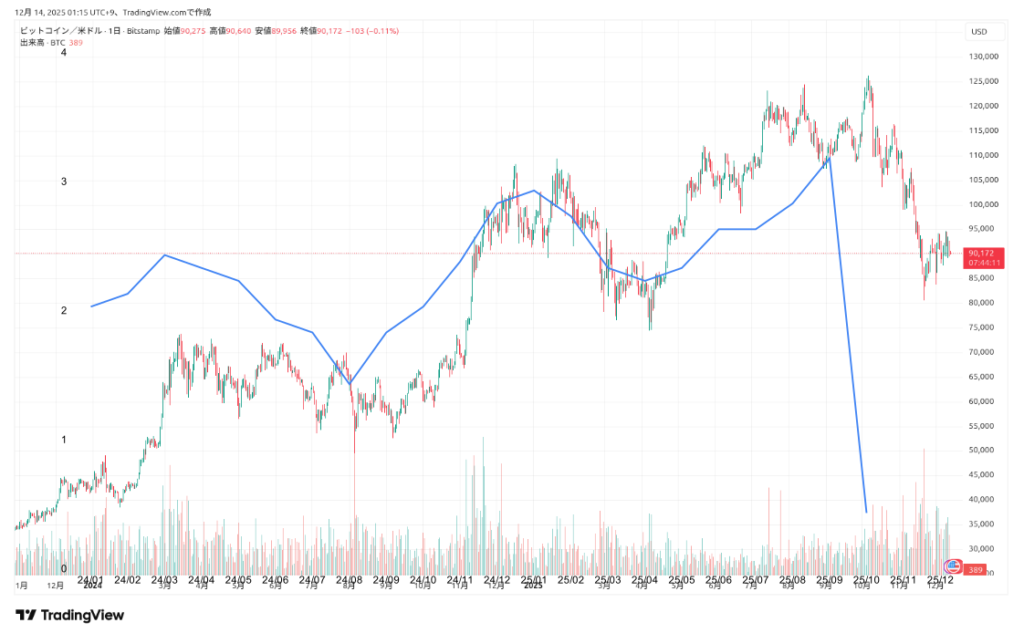 今加えられた青い線、ビットコインのチャートと比べて似ていますか?